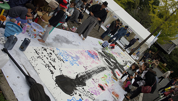 ぺんてる様サポートにより、書家 前田鎌利が子供たちとつくりあげる「もみじアート」